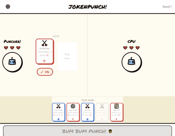 JOKENPUNCH! is the classic Rock-Paper-Scissors made in a new way. Battle your friends via P2P or Local connections, or test your skills against the machine. With unique card effects that change every round and tactical slot management (choosing between attack and defense), every battle offers a fresh challenge.